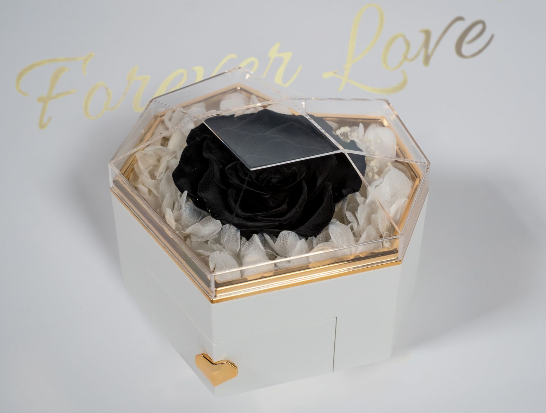 Real Preserved Rose in Heart-Shaped Box - White box , black rose